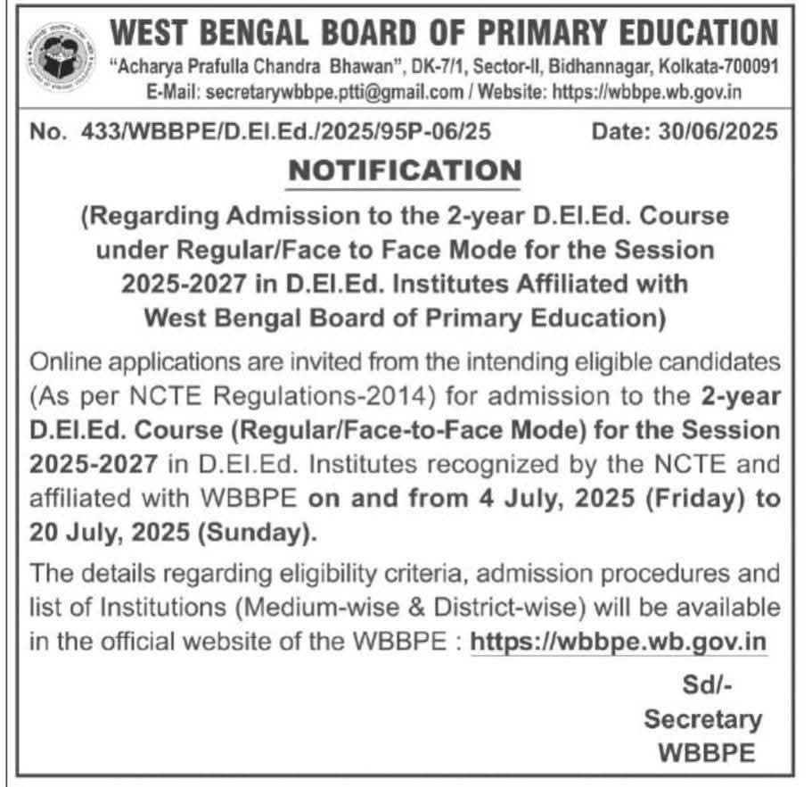 পশ্চিমবঙ্গ প্রাথমিক শিক্ষা পর্ষদ (WBBPE) ২ বছরের D.El.Ed (Diploma in Elementary Education) কোর্সে ভর্তির জন্য ২০২৫-২০২৭ শিক্ষাবর্ষের বিজ্ঞপ্তি প্রকাশ করেছে। এই কোর্সটি রেগুলার মোডে পরিচালিত হবে এবং পর্ষদের অনুমোদিত D.El.Ed প্রতিষ্ঠানগুলির মধ্যে অনুষ্ঠিত হবে।